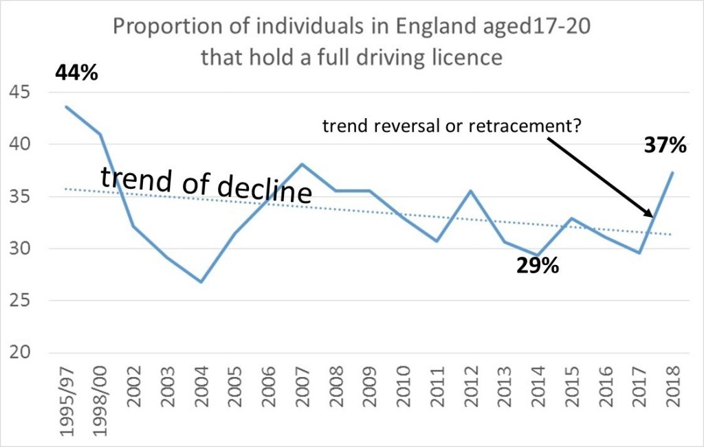 An excellent piece of work led by my UWE colleague Kiron Chatterjee for the DfT, empirically examined young people’s travel behaviour over time. In their report, the following stuck in my mind: “29% of all 17-20 year olds had a full driving licence in 2014 compared to 48% in 1992/94”. Young people’s licence holding declined significantly, indeed substantially, over this period. However, has this meant that it has been, and is, following an ongoing trend of decline? The graph below (based upon DfT’s data table NTS0201) shows how licence holding (in England) between 1995/97 and 2018 has changed. In 1995/97, 44% of 17-20 year-olds had a licence. In 2014 this was down to 29% (as noted above). However, in 2018, licence holding for this age group was back up to 37% (the highest for just over a decade). The trendline shows decline but is 2018 simply a trend retracement or might it be a trend reversal emerging?