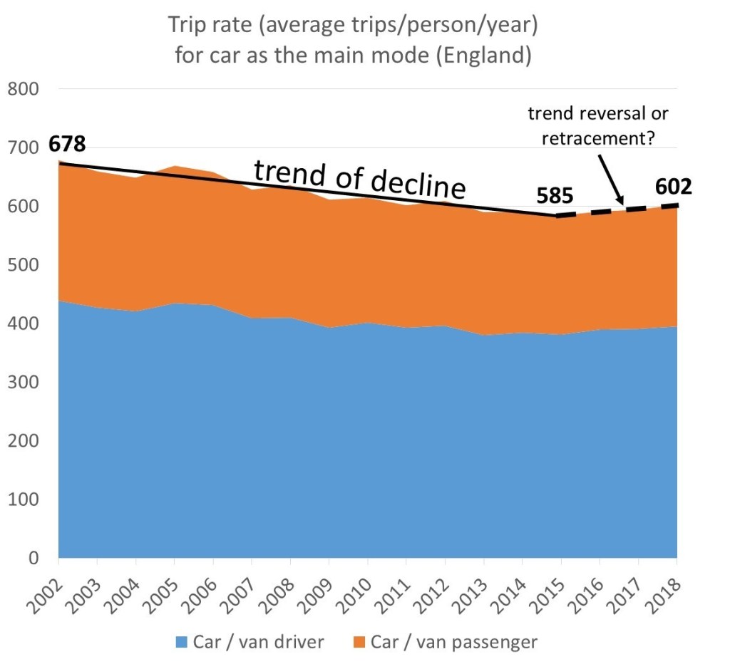 However, from 2015 to 2018 there have been (modest) year on year increases in car trip rates – with a rate of 602 in 2018 (a 3% increase compared to 2015). Car trip rate is no longer in decline but is this recent development a trend reversal or a trend retracement?
