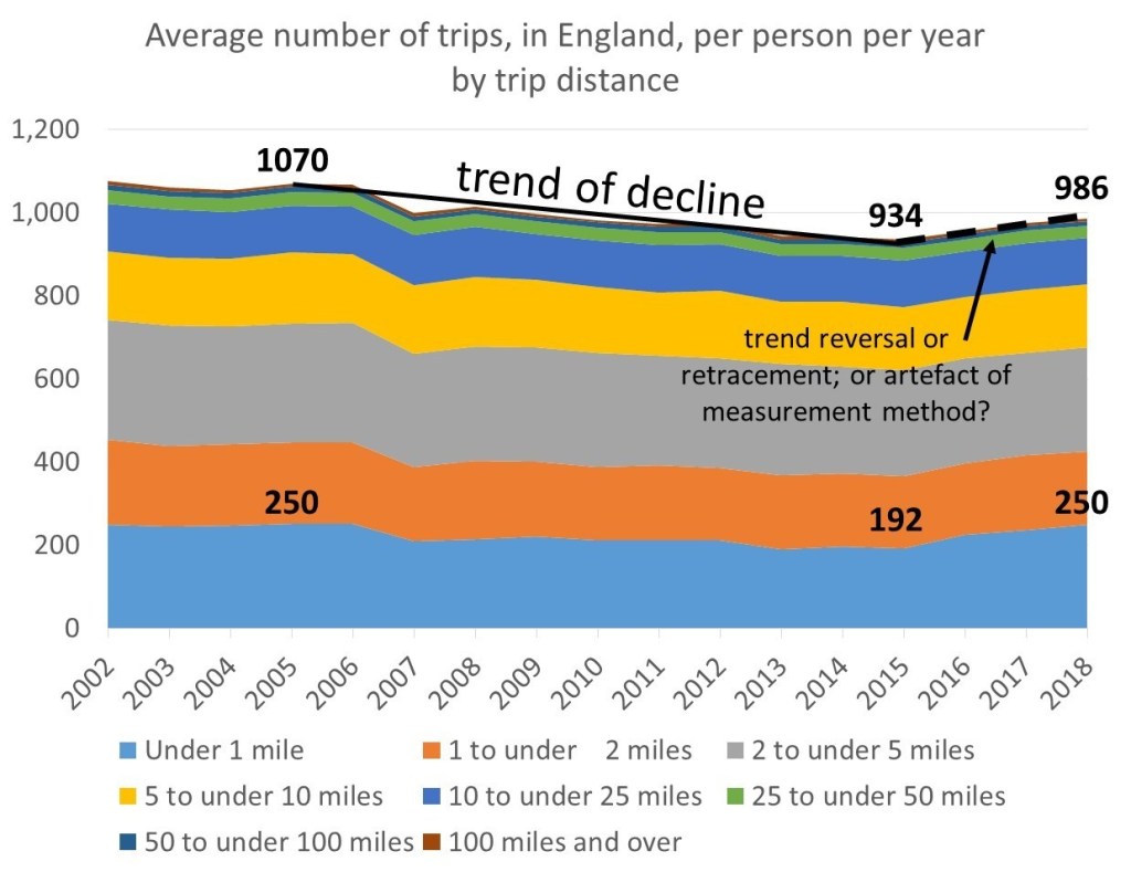 In passing, the additional graph below (drawing up DfT’s NTS0308 data table) shows change in overall trip rate (all modes) and according to trip distance bands. There was a 13% reduction in overall trip rate from 2005 to 2015. From 2015 to 2018 overall trip rate (all modes) has also increased – by 6%. This has been driven largely by a 30% increase in trip rate for trips under 1 mile (most of which are walked). I have separately written on LinkedIn about a possible renaissance in walking. It should be noted that the national travel survey methodology for recording short walking trips changed from 2015. This may explain some of the trip rate increase (though figures have been backwards adjusted by DfT in the NTS data used here). However, taken at face value, overall trip rate is also no longer in decline and we are seeing a trend retracement if not a trend reversal.