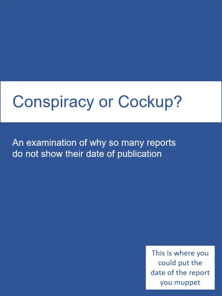 Conspiracy or Cockup? Why do so many reports get published with no clear indication of their date of publication? Is it incompetence on the part of the report authors or a deliberate attempt to make their work appear timelessly contemporary? It’s not big and it’s not clever. Stop doing it and put the publication date of your report on the front cover, p-lease.